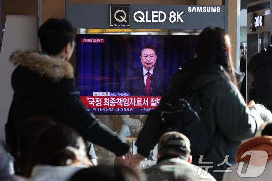 (서울=뉴스1) 신웅수 기자 = 윤석열 대통령에 대한 국회 탄핵안 표결일인 7일 오전 서울역 대합실에서 시민들이 윤 대통령의 대국민 비상계엄 관련 담화를 시청하고 있다. 2024.12.7/뉴스1
