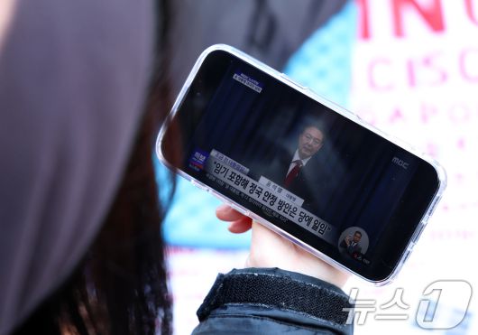 (서울=뉴스1) 구윤성 기자 = 7일 오전 서울 여의도 국회 앞에서 윤석열 대통령의 탄핵을 촉구하며 농성중인 시민이 스마트폰으로 대통령 대국민담화를 시청하고 있다. 2024.12.7/뉴스1kysplanet@news1.krCopyright ⓒ 뉴스1. All rights reserved. 무단 전재 및 재배포, AI학습 이용 금지.