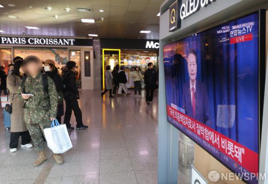 [서울=뉴스핌] 양윤모 기자 = 시민들이 7일 서울역 대합실에서 윤석열 대통령의 계엄사태 관련 대국민 담화를 시청하고 있다. 2024.12.07 yym58@newspim.com