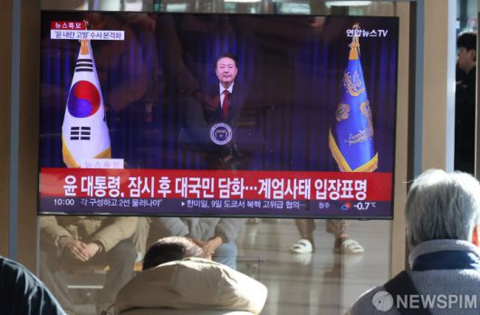 [서울=뉴스핌] 양윤모 기자 = 7일 오전 서울역을 찾은 시민들이 윤석열 대통령 탄핵소추와 '김건희 특검법' 재표결을 앞두고 방송되고 있는 윤 대통령의 '계엄 사태'에 관한 사과 입장 발표 방송을 시청하고 있다. 2024.12.07 yym58@newspim.com
