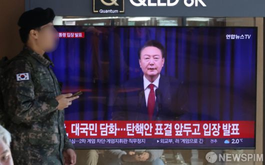 [서울=뉴스핌] 양윤모 기자 = 7일 오전 서울역을 찾은 군인이 윤석열 대통령 탄핵소추와 '김건희 특검법' 재표결을 앞두고 방송되고 있는 윤 대통령의 '계엄 사태'에 관한 사과 입장 발표 방송을 시청하고 있다. 2024.12.07 yym58@newspim.com