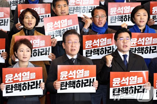 (서울=뉴스1) 구윤성 기자 = 이재명 대표, 박찬대 원내대표를 비롯한 더불어민주당 의원들이 7일 서울 여의도 국회 로텐더홀 계단에서 열린 대통령 담화 규탄 의원총회에서 구호를 외치고 있다. 2024.12.7/뉴스1kysplanet@news1.krCopyright ⓒ 뉴스1. All rights reserved. 무단 전재 및 재배포, AI학습 이용 금지.