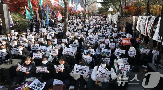 (서울=뉴스1) 이승배 기자 = 윤석열 대통령에 대한 국회 탄핵안 표결일인 7일 오후 서울 여의도 산업은행 인근에서 열린 '윤석열 퇴진 대학생 시국대회'에 참가한 대학생들이 윤 대통령 탄핵을 촉구하고 있다. 2024.12.7/뉴스1photolee@news1.krCopyright ⓒ 뉴스1. All rights reserved. 무단 전재 및 재배포, AI학습 이용 금지.