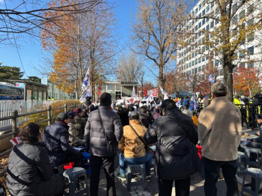 이날 여의대로 반대쪽에서는 보수단체도 결집을 시작했다. 보수단체 집회 참가자들은 한 손에 태극기와 성조기가 달린 깃대를, 반대 손에는 ‘탄핵 저지’라고 써져 있는 피켓을 들고 있었다. 곳곳에서는 문재인 전 대통령과 이재명 더불어민주당 대표의 구속을 촉구하는 외침도 들렸다.