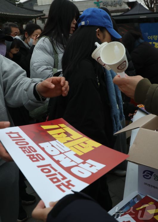 (전주=뉴스1) 유경석 기자 = 7일 전북자치도 전주시 전주객사 앞에서 열린 '윤석열 퇴진 촉구 촛불집회 '에서 참가자들이 손피켓과 초를 받고 있다. 2024.12.7/뉴스1Yks919@news1.krCopyright ⓒ 뉴스1. All rights reserved. 무단 전재 및 재배포, AI학습 이용 금지.