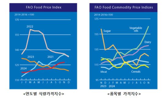 반면 곡물, 육류, 설탕 가격은 하락했다. 곡물 가격지수는 2.7% 내린 111.4다. 밀 가격은 남반구의 수확량 증가와 북반구 주요 수출국의 작황 개선, 국제 수요 감소로 인해 하락했다.