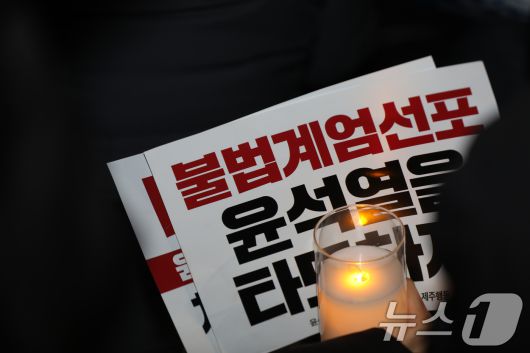 (제주=뉴스1) 강승남 기자 = 윤석열 대통령 탄핵소추안 표결이 진행 중인 7일 오후 제주시청 앞에서 '윤석열 정권퇴진·한국사회대전환 제주행동' 주최의 윤석열 퇴진 촉구 집회가 열리고 있다. 2024.12.7/뉴스1ohoh@news1.krCopyright ⓒ 뉴스1. All rights reserved. 무단 전재 및 재배포, AI학습 이용 금지.