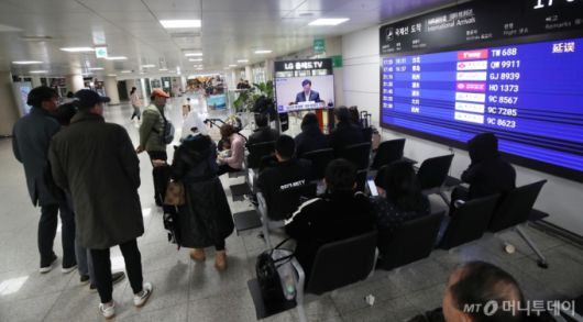 (제주=뉴스1) 오현지 기자 = 7일 오후 제주국제공항 대합실에서 관광객들이 윤석열 대통령 탄핵소추안 표결과 김건희 특검법 재의결 국회 본회의 생중계를 시청하고 있다. 2024.12.7/뉴스1 Copyright (C) 뉴스1. All rights reserved. 무단 전재 및 재배포, AI학습 이용 금지. /사진=(제주=뉴스1) 오현지 기자 |