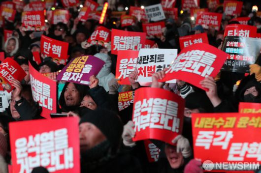 [서울=뉴스핌] 최지환 기자 = 7일 오후 서울 여의도 국회 앞에서 시민들이 윤석열 대통령 탄핵을 요구하며 시위를 하고 있다. 2024.12.07 choipix16@newspim.com