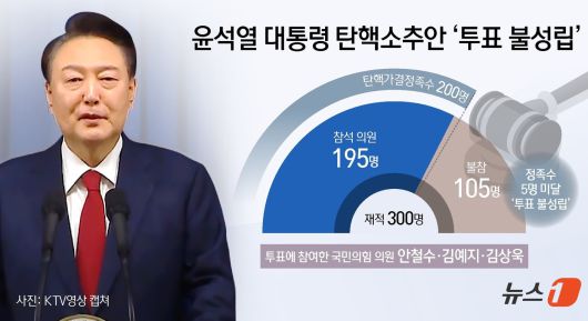 (서울=뉴스1) 김초희 디자이너 = 윤석열 대통령에 대한 탄핵소추안이 7일 국회에서 의결 정족수에 미치지 못해 투표 불성립으로 폐기됐다. 국회는 이날 오후 본회의를 열고 윤 대통령에 대한 탄핵소추안을 표결했지만 재석의원 195명이 참여하는 데 그쳐 투표 불성립으로 폐기됐다. 탄핵안 통과에는 재적의원 3분의 2(200명) 찬성이 필요했다.