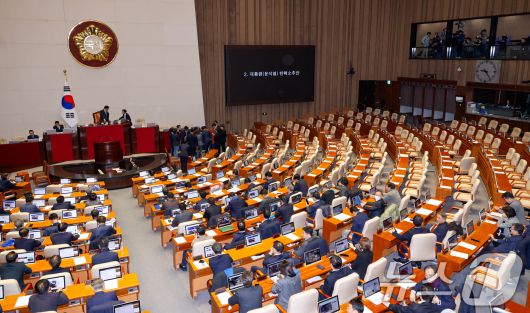 (서울=뉴스1) 안은나 기자 = 7일 오후 서울 여의도 국회 본회의장에서 윤석열 대통령 탄핵소추안이 국민의힘 퇴장 속에 의결 정족수 195명으로 미달, 투표 불성립으로 인해 폐기되고 있다. 2024.12.7/뉴스1coinlocker@news1.krCopyright ⓒ 뉴스1. All rights reserved. 무단 전재 및 재배포, AI학습 이용 금지.