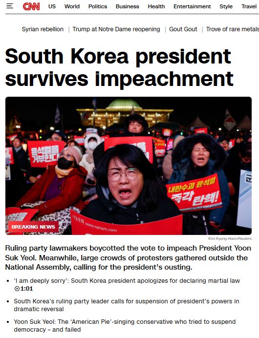 7일 CNN은 홈페이지 메인 기사로 윤석열 대통령의 탄핵안 부결 소식을 전하고 있다 .CNN 홈페이지 갈무리 |