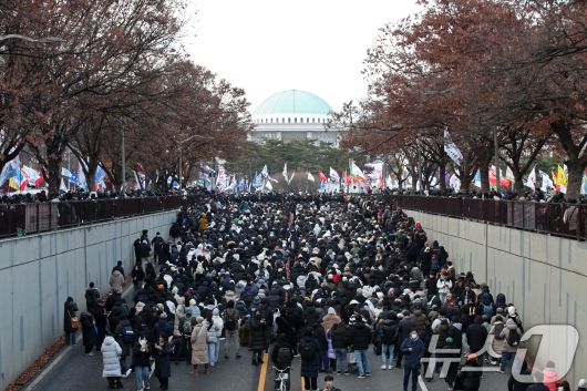 (서울=뉴스1) 이승배 기자 = 윤석열 대통령에 대한 국회 탄핵안 표결일인 7일 오후 서울 여의도 국회 앞에 모인 시민들이 윤석열 대통령 탄핵소추안 가결을 촉구하고 있다. 2024.12.7/뉴스1