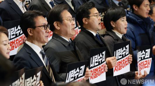 [서울=뉴스핌] 이형석 기자 = 이재명 더불어민주당 대표와 박찬대 원내대표를 비롯한 의원들이 7일 오후 서울 여의도 국회에서 본회의를 마치고 국민의힘 규탄대회를 열고 있다. 2024.12.07 leehs@newspim.com