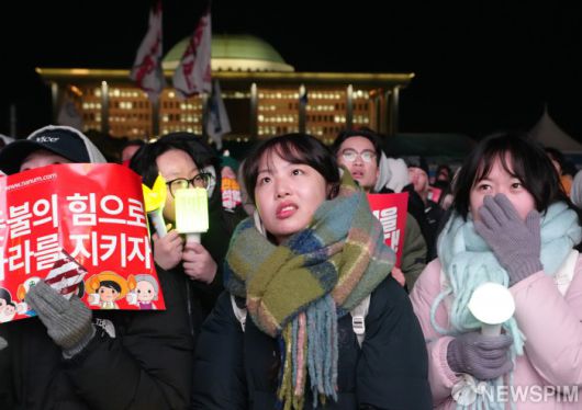 [서울=뉴스핌] 최지환 기자 = 7일 오후 서울 여의도 국회 앞에서 시민들이 투표불성립으로 윤석열 대통령 탄핵안이 폐기되자 분노하고 있다. 2024.12.07 choipix16@newspim.com |