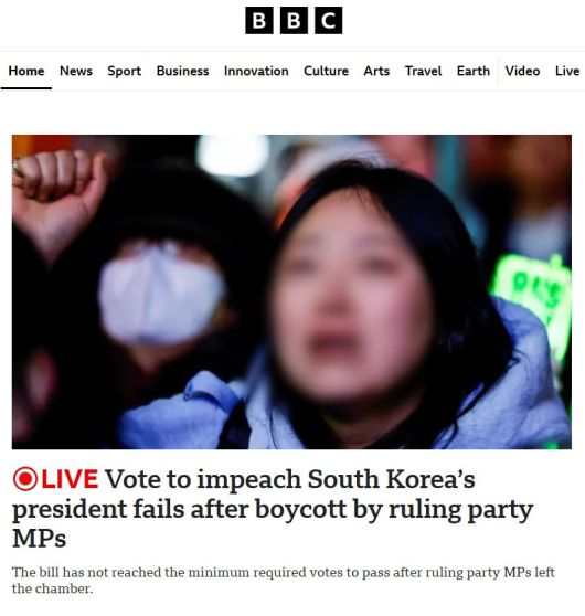 영국 BBC는 이날 홈페이지 최상단 중앙에 대형 라이브 패널을 개설해 실시간으로 관련 속보를 전했다. 오후 11시 기준 촛불집회에 참가한 시민의 사진을 대표 사진으로 걸어둔 BBC는 ‘여당 의원들의 보이콧으로 한국 대통령 탄핵 투표 실패’라는 제목으로 실시간 뉴스를 모아 제공하고 있다.
