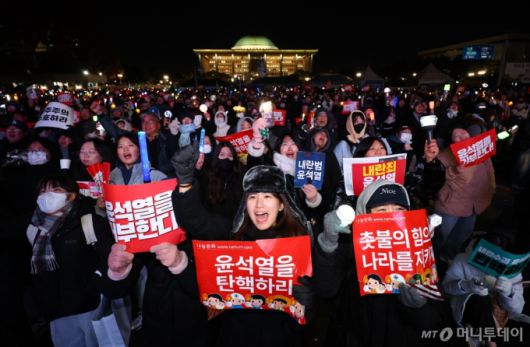 지난 7일 서울 여의도 국회 앞에서 열린 '내란죄 윤석열 퇴진! 국민주권 실현! 사회대개혁! 국민촛불대행진'에 시민들이 윤석열 대통령의 탄핵을 촉구하고 있다/사진=뉴시스 /사진=황준선 |