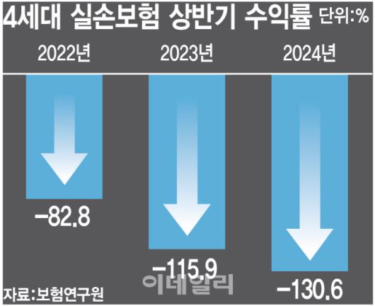 지난 2021년 7월부터 판매한 4세대 실손은 염좌 및 긴장 환자의 비급여 과잉 진료 가능성이 있는 것으로 나타났다. 4세대 위험손해율은 2021년 61.2%에서 올해 상반기 기준 131.4%까지 치솟으며 3년여 만에 2배 이상(114.7%) 악화했다. 최근 요율 정상화 등으로 1·2세대 손해율이 일부 개선된 것과 달리, 4세대 손해율은 지속 악화하는 실정이다.