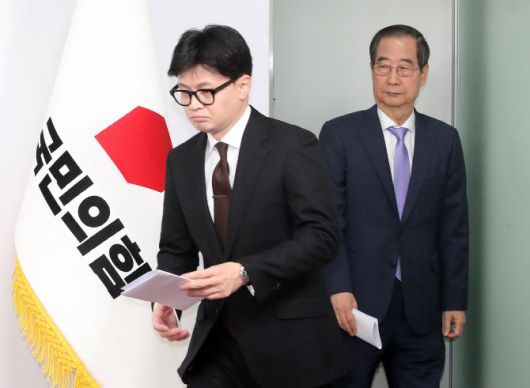 한덕수 국무총리(왼쪽)와 한동훈 국민의힘 대표가 8일 서울 여의도 국민의힘 당사에서 국정 수습 방안에 대한 공동 담화문을 발표하기 위해 입장하고 있다. 사진=방인권 기자 |