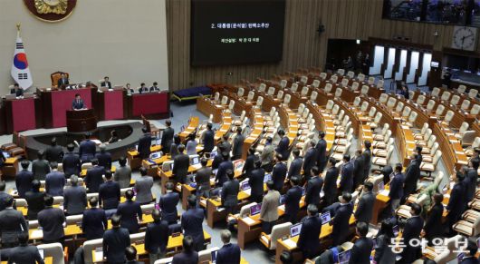 7일 오후 국회 본회의에서 더불어민주당 박찬대 원내대표가 대통령 탄핵소추안에 대해 제안 설명을 한 뒤 국민의힘 의원 이름을 한 명씩 부르며 표결 동참을 호소하고 있다. 국민의힘 측 의석에선 안철수 의원(오른쪽 상단)만 퇴장하지 않고 자리에 남았다. 이날 여당에서는 안 의원 외에 김예지 김상욱 의원만 본회의장에 돌아와 투표에 참여했다.