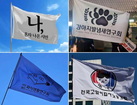 시민들이 7일 오후 서울 여의도에서 열린 ‘대통령 탄핵 촉구 집회’에 들고 나온 깃발들. 특정 단체 소속이 아닌 자발적으로 나왔음을 강조하면서도 자신의 정체성을 유쾌하게 표현했다. SNSㆍ인터넷 캡처 |