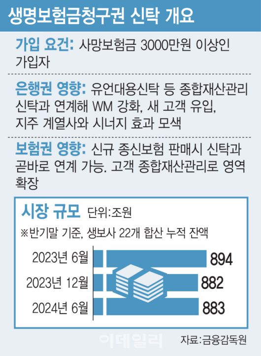 [이데일리 김나경 기자] ‘내 사망 보험금을 내 뜻에 맞게’ 집행하는 생명보험금청구권 신탁이 첫 출시 한달 만에 대중적으로 흥행하면서 금융권의 신탁업 규제 완화 목소리가 커지고 있다. 삼성생명의 3억원 미만 보험금 신탁이 전체 60%에 달하는 등 ‘종합자산관리’가 더 이상 부유층 전유물이 아닌 만큼 시대변화에 맞게 규제를 풀어야 한다는 것이다. 재개발·재건축 부동산으로 수탁자산을 확대하고, 금융사가 비금융사에 업무를 위탁해 신탁을 활성화하는 방안이 힘을 얻고 있다.