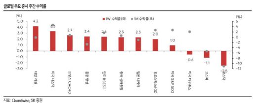 조준기 SK증권 연구원에 따르면 지난주는 글로벌 증시와 국내 증시의 디커플링이 강하게 발생했다. 미국 공급관리협회(ISM) 제조업지수 호재로 강한 상승세 보였던 코스피는 대내 정치적 리스크가 크게 부각되는 상황이 전개되며 글로벌 증시 대비 크게 밑도는 흐름을 보였다. 11월 수출 부진으로 펀더멘털 우려까지 있는 상황에서 대내적인 추가 리스크까지 부각됐기 때문이다.