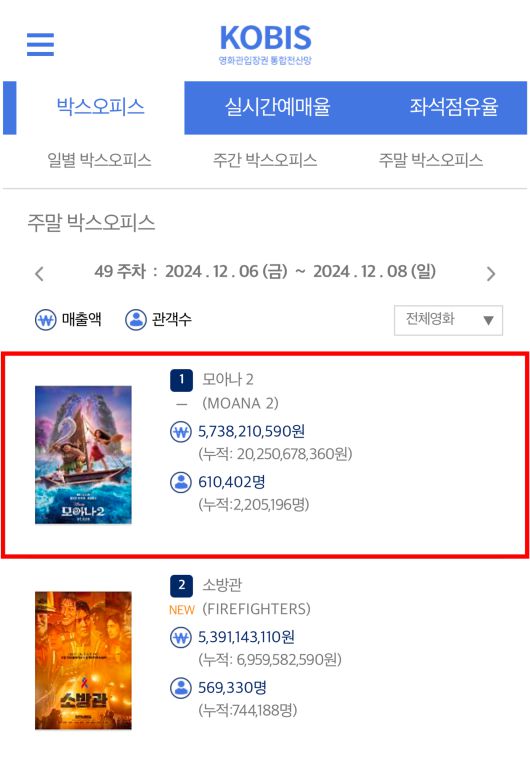 전체 박스오피스 1위를 기록했다. '소방관', '1승' 등 신작들의 개봉 속에서도 흔들리지 않고 정상 자리를 지켜냈다. '모아나' 전편 관객 수 돌파도 목전에 두고 있다.