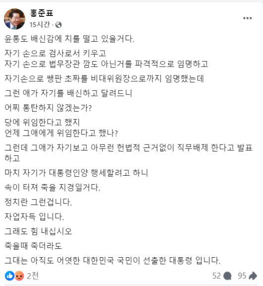 홍준표 대구시장이 윤석열 대통령에게 "그대는 아직도 어엿한 대한민국 국민이 선출한 대통령"이라고 말했다./사진=홍준표 페이스북 캡처 |