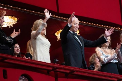 조 바이든 미국 대통령과 질 바이든 여사 부부가 8일(현지시간) 카멀라 해리스 부통령 부부 등과 함께 워싱턴의 케네디센터에서 열린 47회 케네디센터 공로상 시상식에 참석하고 있다. AFP연합뉴스 |