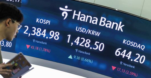9일 오전 서울 중구 하나은행 본점 딜링룸 전광판에 이날 거래를 시작한 코스피와 원-달러 환율, 코스닥 지수가 표시돼 있다. 연합뉴스 |