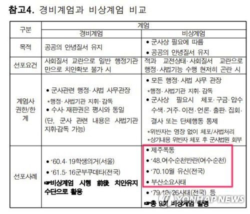 9일 추미애 국회의원(국방위원회, 더불어민주당 하남시갑)에 따르면 12·3 계엄사령부의 '계엄사-합수본부 운영 참고 자료'에는 비상계엄 선포사례로 '제주폭동'과 '48. 여수·순천반란(여수·순천)', '부산소요사태', '79. 10·26사태(전국)' 등을 들었다.