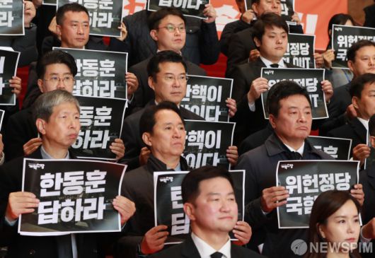[서울=뉴스핌] 이형석 기자 = 개혁신당이 9일 오전 서울 여의도 국회에서 윤석열 대통령 탄핵 촉구 피켓을 들고 있다. 2024.12.09 leehs@newspim.com