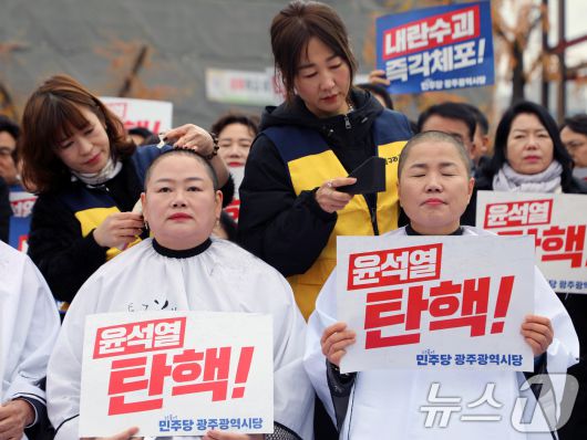 (광주=뉴스1) 이수민 기자 = 더불어민주당 문선화 광주 동구의원(왼쪽)과 오영순 광주 남구의원(오른쪽) 등 광주 지방의원들이 9일 오후 동구 5·18민주광장에서 '12·3 내란 주범 윤석열 탄핵 즉각 구속 촉구' 성명문을 발표한 후 삭발식을 하고 있다. 2024.12.9/뉴스1