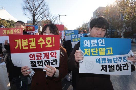 8일 서울 종로구 대학로에서 열린 서울대병원 전공의협의회 비상대책위원회 ‘젊은 의사 의료계엄 규탄 집회’에서 사직 전공의를 비롯한 젊은 의사들이 계엄 규탄 및 의료개혁 철폐를 촉구하고 있다. |