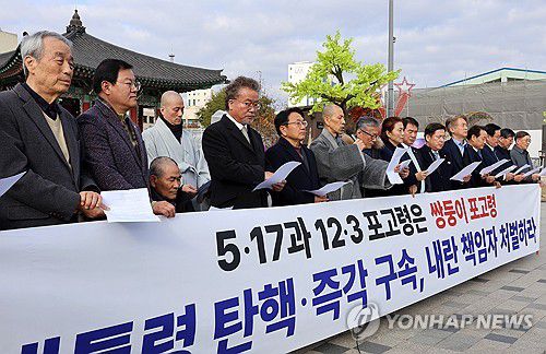 군사정권 당시 민주화운동에 참여한 광주지역 원로들도 광주 동구 전일빌딩에서 긴급 회동을 갖고 "내란 수괴 윤석열을 즉각 구속하고 한동훈과 한덕수는 제2의 쿠데타를 즉각 중단하라"고 주장했다.