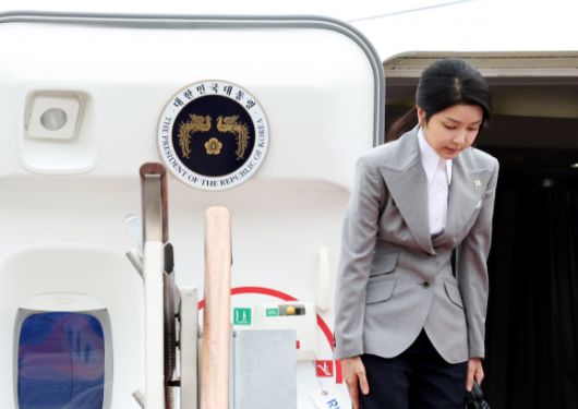 인사하는 김건희 여사 - 김건희 여사가 19일 성남 서울공항에서 윤석열 대통령의 체코 공식 방문에 동행하며 대통령 전용기인 공군 1호기에 올라 인사하고 있다. 2024.9.19 연합뉴스 |