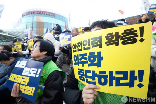 [서울=뉴스핌] 정일구 기자 = 엄길용 공공운수노조 위원장 등 조합원들이 9일 오후 서울 중구 서울역 광장에서 열린 '힘내라 철도, 퇴진하라 윤석열' 철도파업 지지 문화제에서 손팻말을 들고 있다. 2024.12.09 mironj19@newspim.com