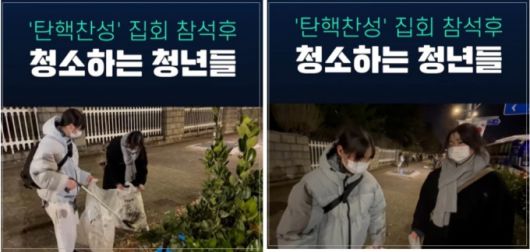 지난 8일 유튜브 채널 '뉴탐사'에는 '탄핵 찬성 집회 참석 후 청소하는 청년들'이라는 제목의 쇼츠(짧은 영상)이 올라왔다.