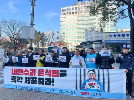 [인천=이데일리 이종일 기자] 진보당 인천시당은 9일 인천경찰청 앞에서 기자회견을 열고 “내란 수괴 윤석열 대통령을 구속수사하라”고 촉구했다.