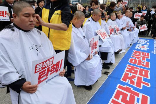 9일 오후 광주 동구 5·18민주광장에서 더불어민주당 광주 기초 및 광역의원들이 윤석열 탄핵 촉구 공동 성명을 발표한 뒤 삭발을 하고 있다. 연합뉴스 |