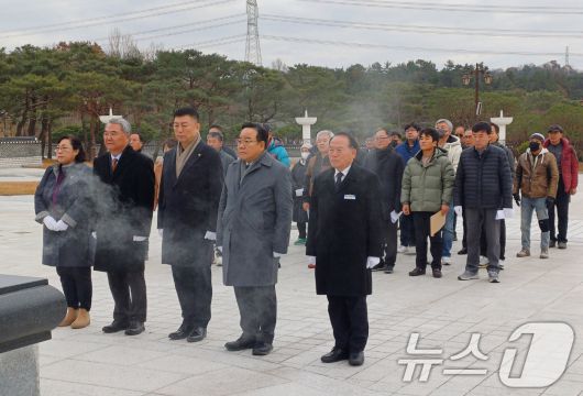 (광주=뉴스1) 박준배 기자 = 5·18민주유공자유족회와 5·18민주화운동부상자회, 5·18민주화운동공로자회, 5·18기념재단 등 5월 단체가 9일 광주 북구 운정동 국립5·18민주묘지를 참배하고 '윤석열 대통령 탄핵'을 다짐하고 있다. (5.18재단 제공)2024.12.9/뉴스1