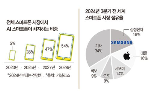 시장조사업체 카날리스에 따르면, 전체 스마트폰 중 AI 스마트폰이 차지하는 비중은 올해 16%, 내년 28%로 성장해 2028년에는 전체의 54%를 차지할 것으로 전망된다. 다만 애플 인텔리전스는 아직 한국어로는 쓸 수 없으며, 현재 미국 영어로만 사용 가능하다. 한국을 포함한 다른 국가의 언어는 내년부터 순차적으로 도입된다. 애플은 2025년 4월 업데이트를 통해 한국어, 중국어, 영어(인도), 영어(싱가포르), 프랑스어, 독일어, 이탈리아어, 일본어, 포르투갈어, 스페인어, 베트남어 등의 언어를 지원할 것이라고 밝혔다.