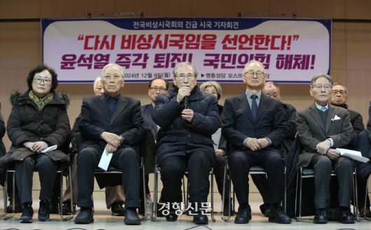 함세웅 신부 등 시민사회 원로들로 구성된 ‘전국비상시국회의’는 이날 오후 서울 중구 명동성당에서 긴급 시국 기자회견을 열고 “민주적 헌정 질서를 군홧발로 짓밟은 윤석열을 대통령 지위에 그대로 남겨둔 현실에 직면했다”며 “국민의힘 소속 의원들의 파렴치한 작태에 경악과 분노를 금할 수 없다”고 밝혔다.
