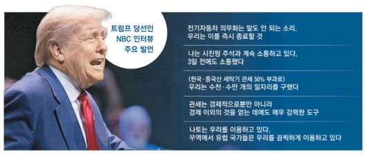 트럼프 당선인은 유럽의 방위비와 무역 불균형 문제를 지적하면서 러시아 위협에 대응한 안보 동맹체인 북대서양조약기구(NATO·나토)에서의 미국 탈퇴까지 시사했다. 그는 "나토가 우리를 이용하고 있다. 무역에서 유럽 국가들은 우리를 끔찍하게 이용하고 있다. 그들은 우리 자동차와 식료품 등 아무것도 가져가지 않는다"고 말했다. 선거운동 과정에서 트럼프 당선인은 한국에도 방위비 분담금 인상을 요구하겠다고 여러 차례 언급했던 만큼, 압박에 나설 가능성이 작지 않을 것으로 관측된다.