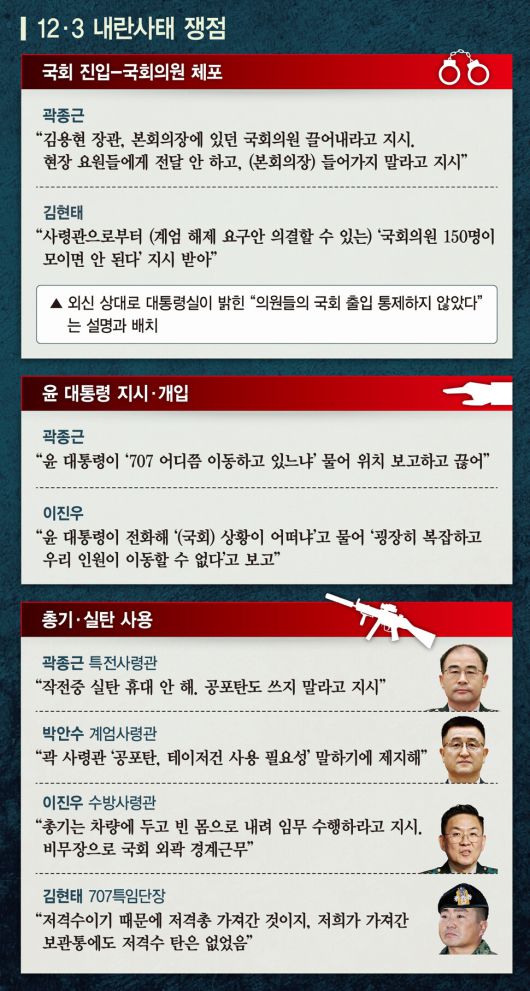 김 단장은 당시 김용현 장관이 곽종근 특전사령관을 통해 구체적으로 작전 지시를 했다고도 밝혔다. 그는 “제가 (특전)사령관한테 첫 전화 받고 끝날 때까지 30통 이상 전화를 받았다”며 “그 말은 다른 여단장들까지 해서 사령관은 1시간 반 동안 100통 이상 전화를 했다는 뜻이다. 제가 확인한 바로는 (김용현) 전 국방부 장관이 지휘통제실에서 계속 전화를 하고 있었고, 그 전화를 들은 것을 그대로 지휘통제실에서 전달하기 급급했다”고 했다. 그러면서 “김 전 장관이 ‘야, 빨리 들어가서 국회의원들 끌어내’ 이런 말을 한 것을 지휘통제실에서 ‘국회의원들 끌어내려. 빨리 전달해’ 이런 형태였다는 것”이라며 “저는 사실 1~2분 간격으로 전화를 받았다”고 털어놨다.