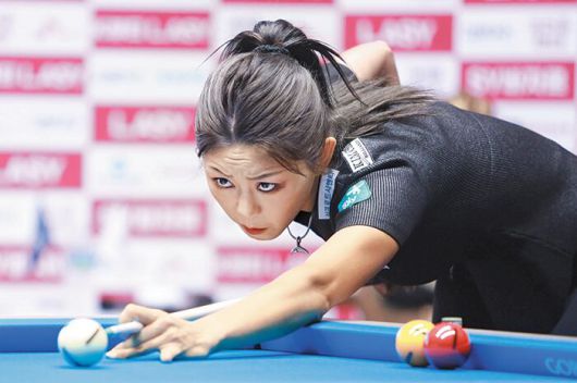 8일 밤 강원도 정선군 하이원 리조트 그랜드 호텔 컨벤션 타워에서 열린 여자 프로 당구(LPBA) 2024-25시즌 7차 대회 하이원 리조트 챔피언십 결승. 6세트에서 마지막 11번째 득점을 뽑아내면서 자신보다 열다섯 살 어린 김보미(26)를 세트 점수 4대2로 누르고 우승을 확정한 김가영(41)이 큐를 번쩍 들며 활짝 웃었다. ‘당구 여제’란 칭호가 붙은 그는 이날 프로 당구 투어(PBA)에서 5대회 연속 우승이란 새 역사를 썼다. 2019년 출범한 PBA 남녀부 통틀어 최초다.