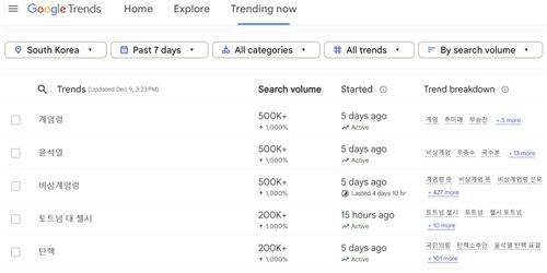 '구글 트렌드' 검색 데이터에 따르면 지난 2일부터 9일까지 국내에서 검색량이 가장 큰 폭으로 늘어난 단어는 '계엄령'과 '윤석열'로 파악됐다. 두 단어는 일주일 새 각 50만여번 검색됐다. 평상시보다 1,000% 이상 급증한 수준으로 보인다.