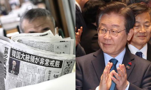 윤석열 대통령의 비상계엄 관련 소식이 일본 니혼게이자이신문 조간 1면에 보도된 지난 4일 일본 오사카우메다역에서 한 시민이 신문을 읽고 있다. 오른쪽은 이재명 더불어민주당 대표가 9일 서울 여의도 국회에서 열린 의원총회 뒤 태극기 배지를 달고 규탄 퍼포먼스를 한 뒤 손뼉을 치고 있다. 오사카=뉴시스·연합뉴스 |