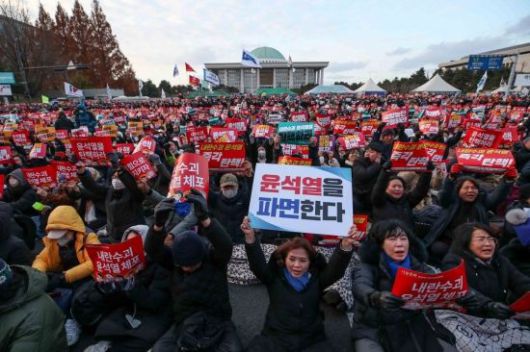 윤석열 대통령 탄핵소추안 표결일인 7일 서울 여의도 국회 앞에서 시민들이 윤 대통령의 탄핵을 촉구하고 있다. 강진형 기자 |